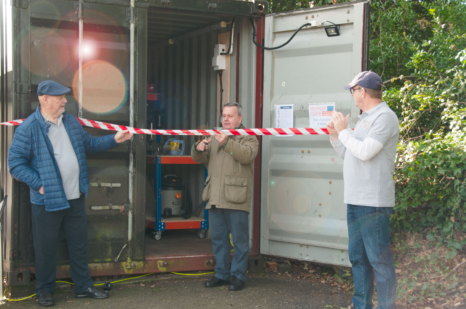 Repair Café – Sam Charles, Hants CC Rob Humby cutting ribbon and Mark Tizzard