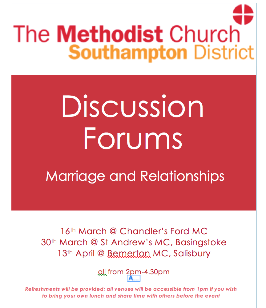 As a District we are keen to continue the conversations around Marriage & Relationships, especially in light of the subject coming to Conference in 2020. We have therefore tasked a group to facilitate 3 forums around the District, to enable safe and informative discussions together. We welcome all; please do book onto a session by emailing: chairspa@sdmc.org.uk