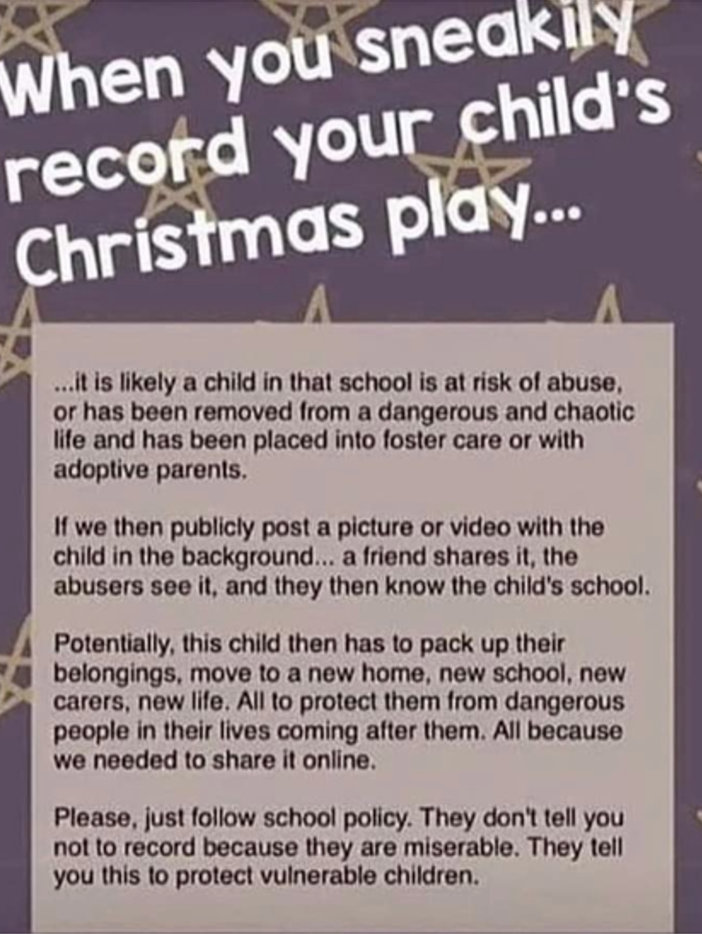 Please think before recording, sharing a recording or live steaming Christmas concerts, nativity plays etc.